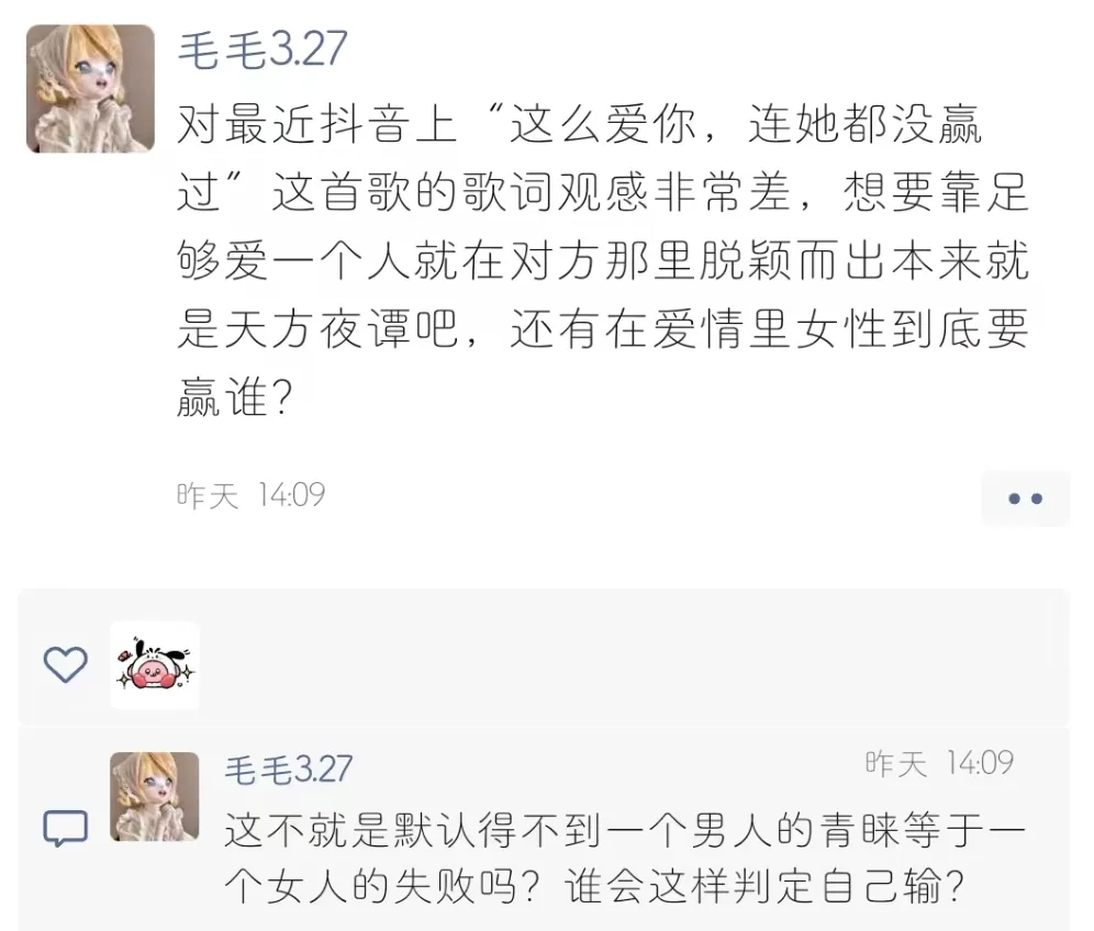 扯远了哈哈,这句歌词确实很容易被拿出来讨论,因为这几年女性主义的兴起和对男女平权的提倡,这首歌传递的雌竞观念必然要被批评的,属于是太岁头上动土了。